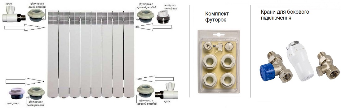 Футорки (переходники) необходимы для соединения радиатора с кранами, если диаметр выходов не совпадает с диаметром системы отопления. Также потребуются заглушки, устанавливаемые на неиспользуемые выходы радиатора.