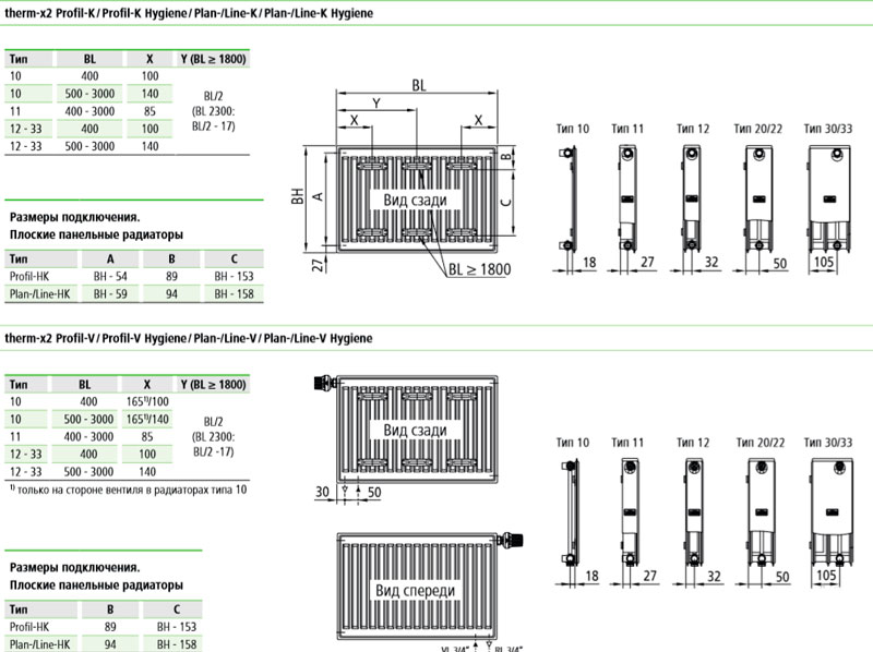 - 21 тип - радиатор с передней и задней стенкой и одним рядом конвекторной решеткой. Глубина - 64 мм.