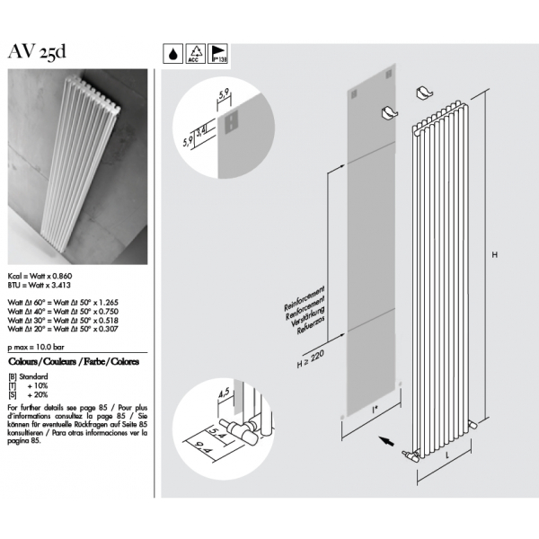 Дизайнерский радиатор Antrax AV 25D состоит из двух рядов круглых вертикальных трубок приваренных к горизонтальному коллектору. Диаметр трубки - 25 мм, диаметр коллектора - 35 мм. Произведен на заводе в Италии. Привлекательный внешний вид помагает вписаться в любой интерьер. Стандартно окрашен в белый цвет, возможна покраска по палитре Антракс, в зависимости категории цвета наценка за покраску составляет 10-20%.