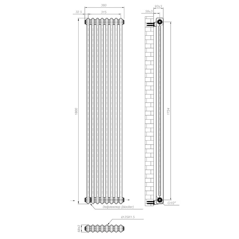 | 1800Х380 | 2 ряда | 1073 Вт | 1348 Вт | 10-13 м2 | 6 бар | Боковое | 1/2" |