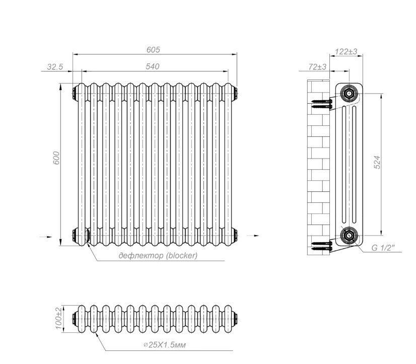 | 600х785 | 3 ряда | 990 Вт | 1242 Вт | 10-13 м2 | 6 бар | Боковое | 1/2" |