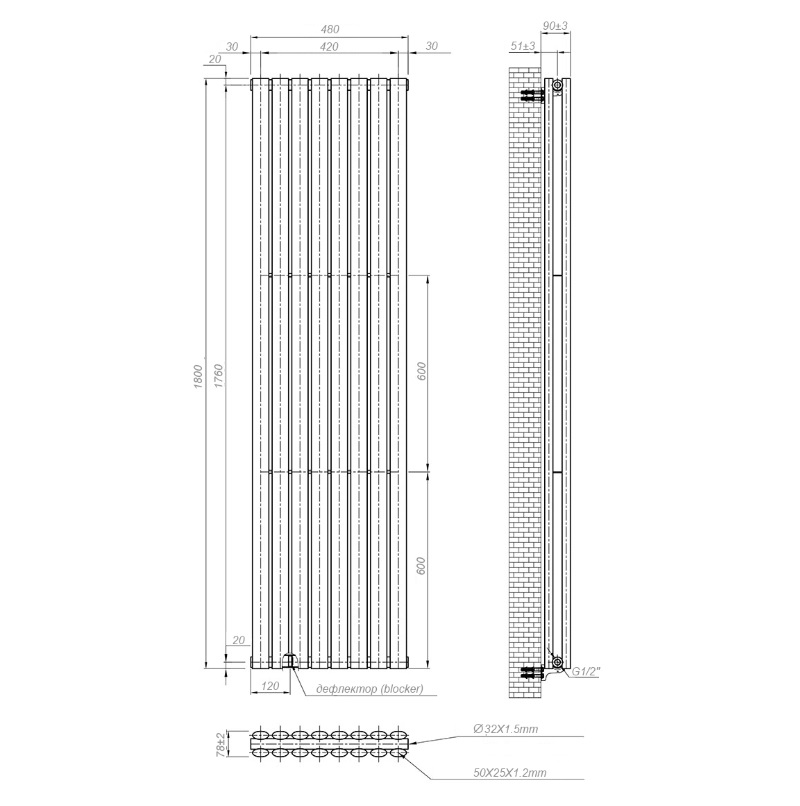 - Теплоотдача ΔT 50 °C - 1732 Вт