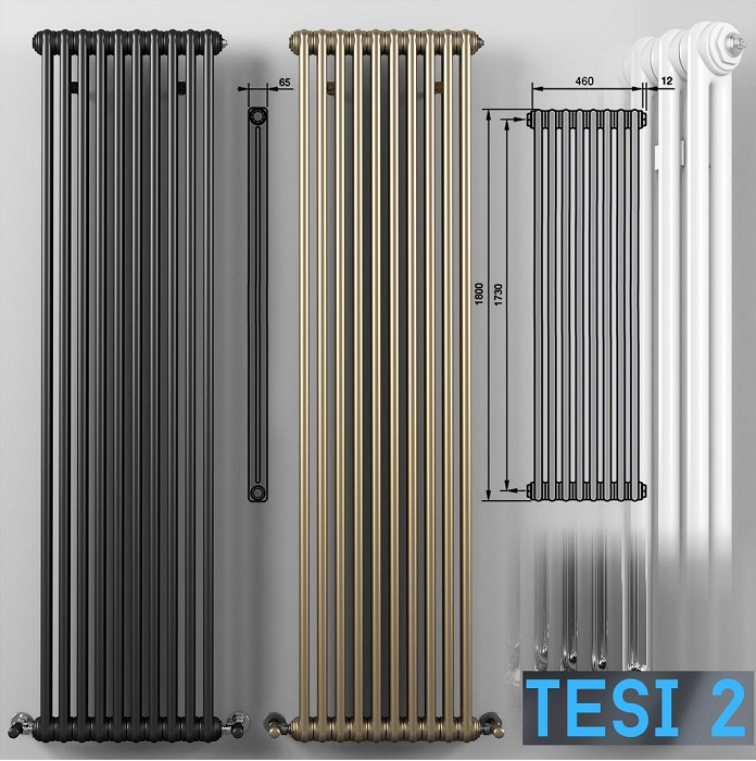 Модель Tesi 2 представляет собой трубчатый радиатор с двумя трубками по глубине (65 мм), форма трубки – круглая, диаметр трубки – 25 мм, секционность – 1-40, высота 200-2500 мм.