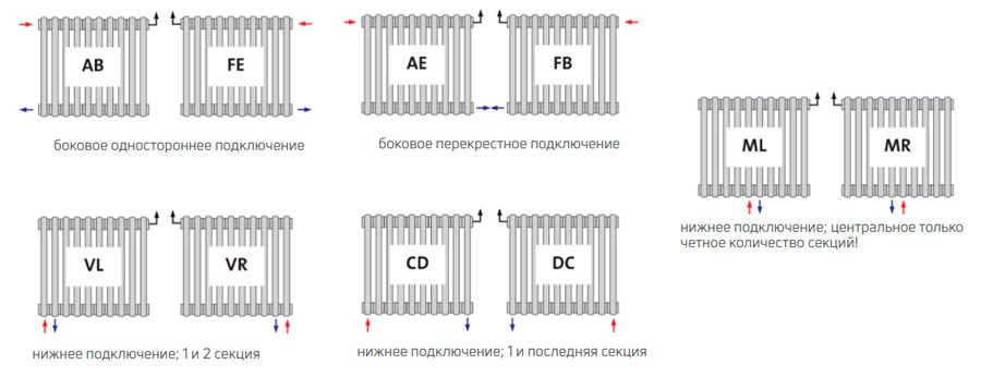 При заказе трубчатого радиатора обязательно нужно определиться со способом подключения радиатора (вывода труб), тем более что вариантов очень много: