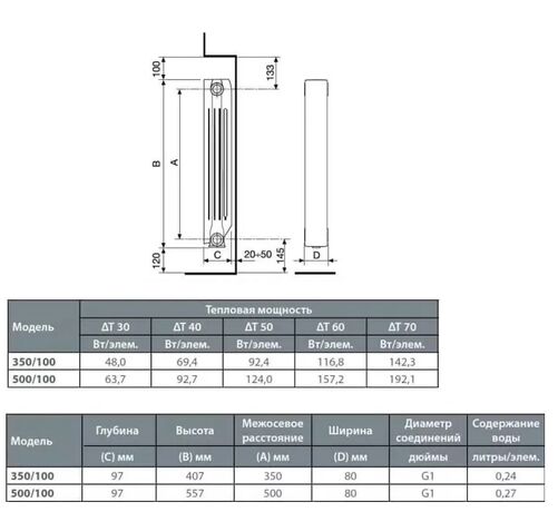| Кількість секцій | Висота (габаритна), мм | Висота (між), мм | Ширина, мм | Глибина, мм | Тепловіддача (ΔT 70C), Вт | Тепловіддача (ΔT 50C), Вт | Вага, кг | Вміст води, л | Розмір підключення | Робочий тиск |