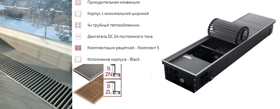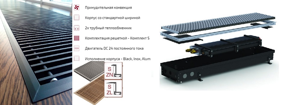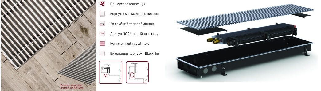Конвектор має найменшу глибину в асортименті даного бренду, яка складає 65 мм. Має 2 варіанти виконання: М - з вбудованим нез'ємним куточком (рамкою) для перекриття стиків, при монтажі рамка накладається поверх чистової підлоги, С - без куточка, монтаж стик короба в стик з підлоговим покриттям.