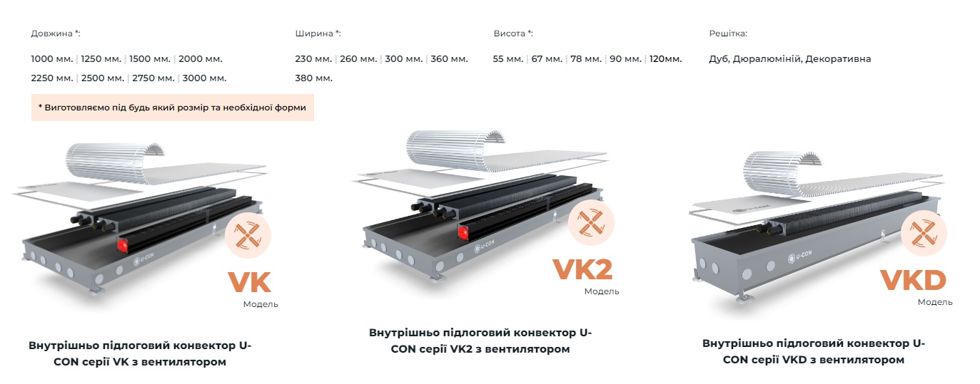 Компанія Ю-кон пропонує не тільки великий асортимент типорозмірів, а й прилади з різними типами вентиляторів - VK (фанкойли з вентиляторами на змінному струмі 220В) і VK DC (фанкойли з вентиляторами на постійному струмі 24В). Внутрішньопідлогові конвектори з 24-вольтовими вентиляторами вважаються більш безпечними та економічними (менше споживають електроенергії).