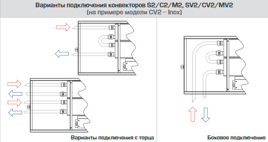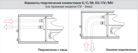 Розташування внутрішньопідлогового конвектора до вікна з примусовою конвекцією за замовчуванням вважається з лівостороннім підключенням, якщо конвектор необхідно підключити праворуч, це необхідно вказувати при замовлення чи купівлі. На заводі виробника роблять виходи під праву сторону. Теплообмінник має бути з боку вікна.