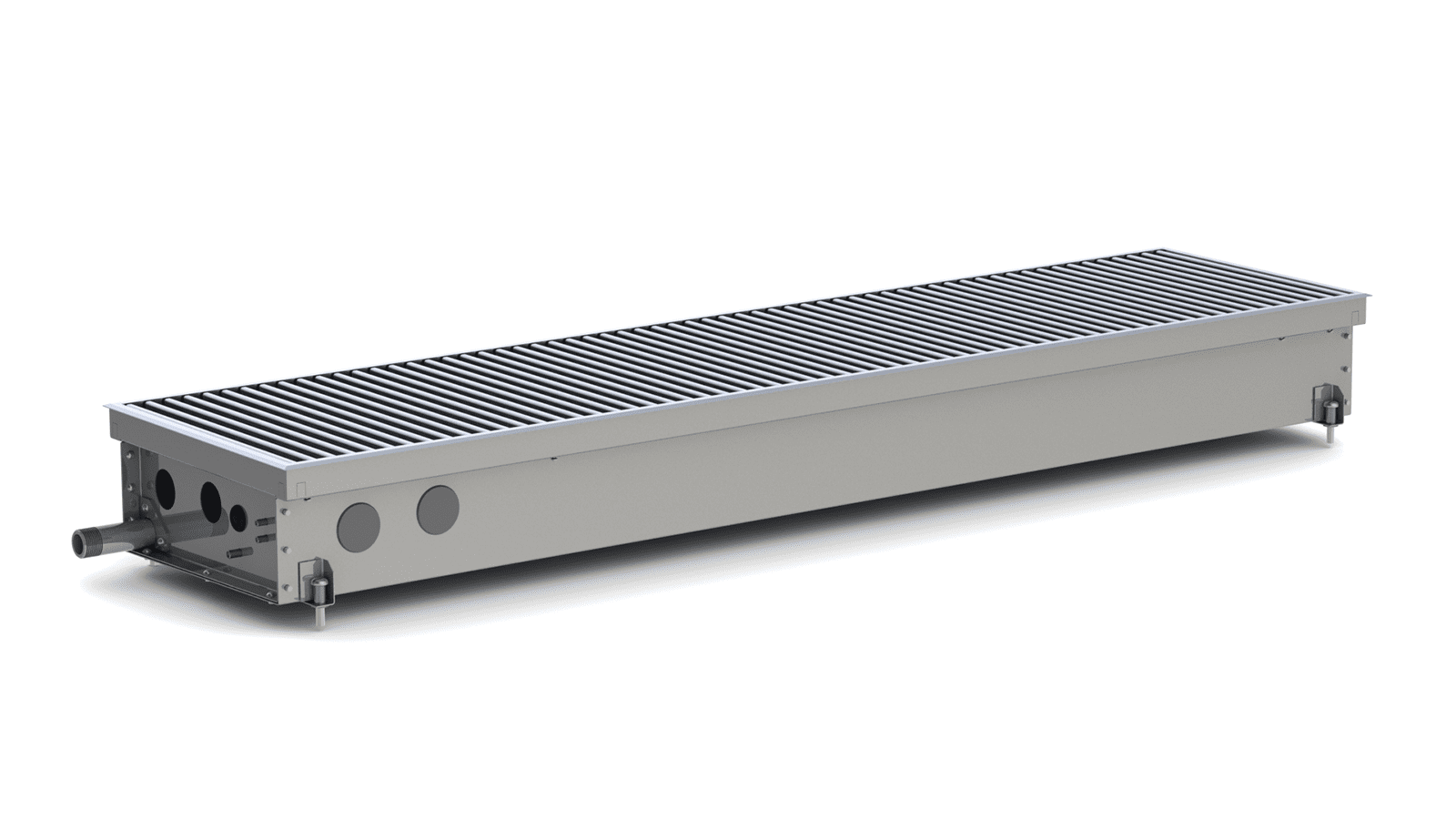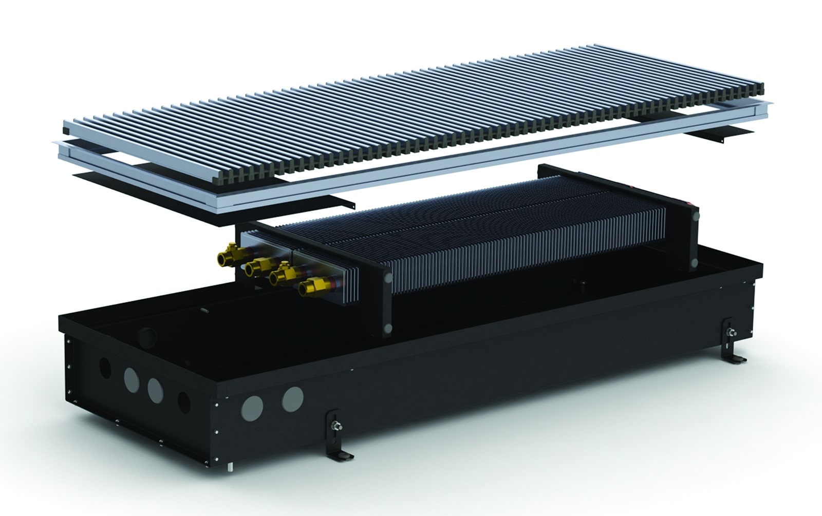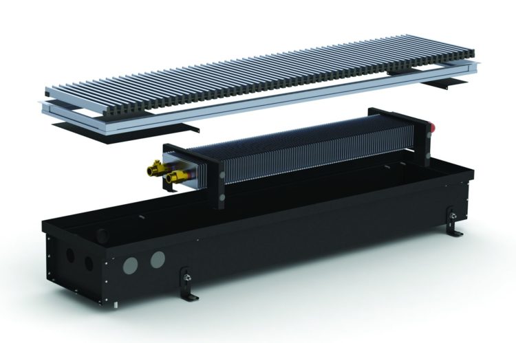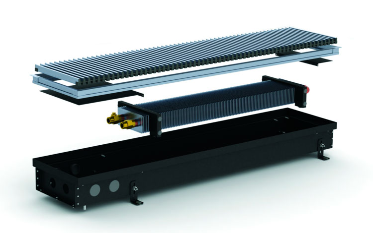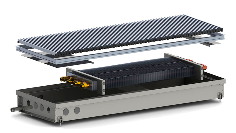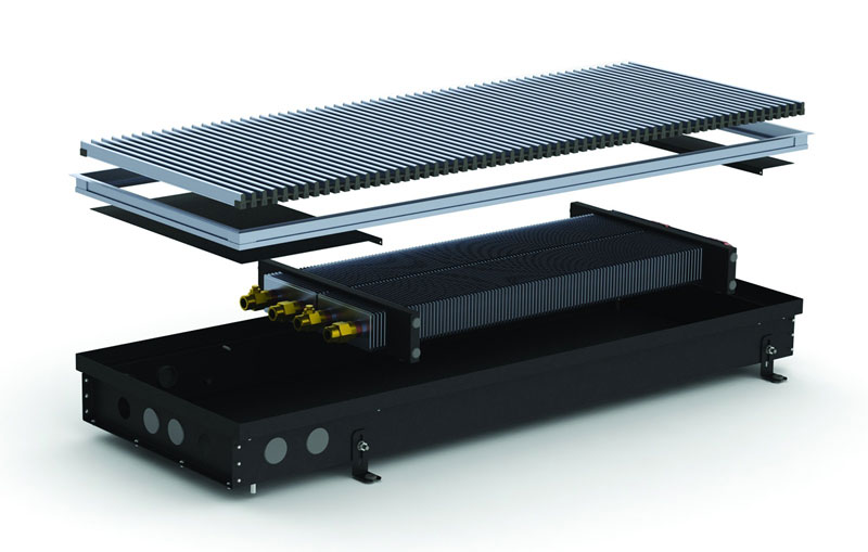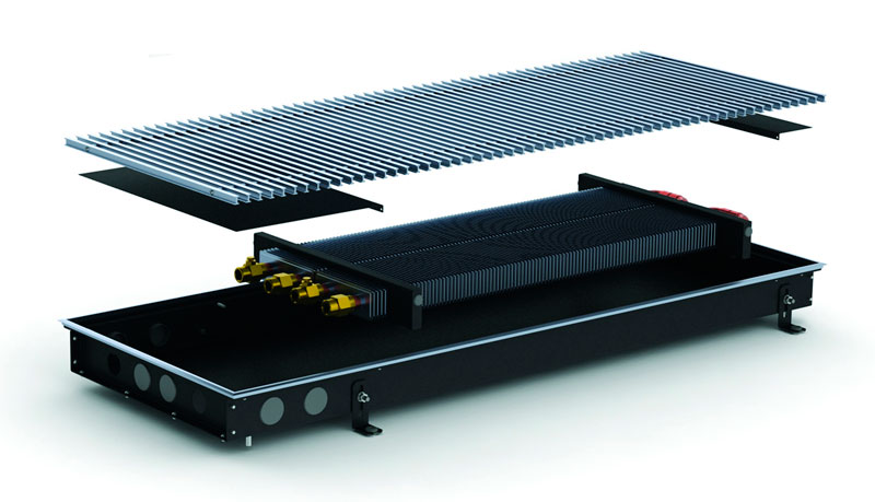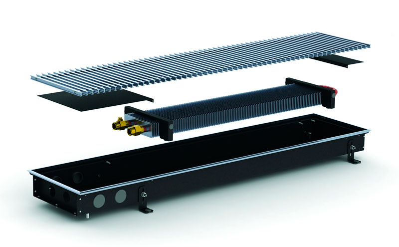 Безвентиляторні моделі використовують як додаткове джерело опалення/теплову завісу або для обігріву невеликих приміщень, що утеплюють. Складається внутрішньопідлоговий конвектор Каррера з коробу, який виготовлений із сталі, пофарбованої в чорний колір, або нержавіючої сталі. Звернімо вашу увагу на те, що більшою популярністю в невологих приміщеннях користуються корпуси, пофарбовані в чорний колір, завдяки фарбуванню менше проглядаються внутрішні частини конвектора і він стає ще непомітнішим. Усередині короба знаходиться теплообмінник, що складається з мідної трубки з товщиною стінки 1 мм, а також алюмінієвих пластин, насаджених на трубу методом розвальцювання. Теплообмінник закріплений у коробі за допомогою касетного типу кріплення, що дозволяє легко його діставати та ставити на місце.