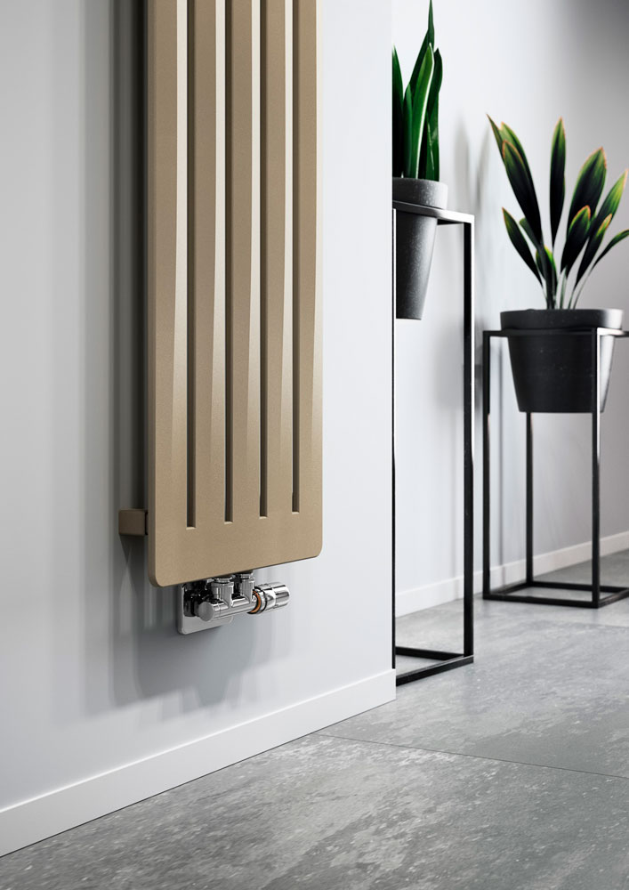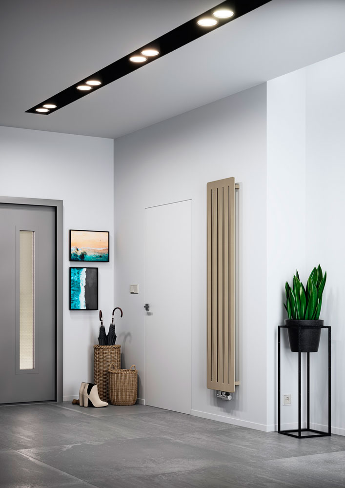 Terma Aero V - дизайнерський вертикальний радіатор від перевіреного польського виробника опалювальної техніки. Оригінальний дизайн не схожий на звичні трубчасті батареї, а є цілісною плоскою панеллю з вертикальними прорізами, ширина прямокутних секцій - 70 мм, глибина - всього 11 мм. Така конструкція справді створює враження легкості та повітряності. Унікальна форма даного приладу була створена завдяки технології "керованій деформації".