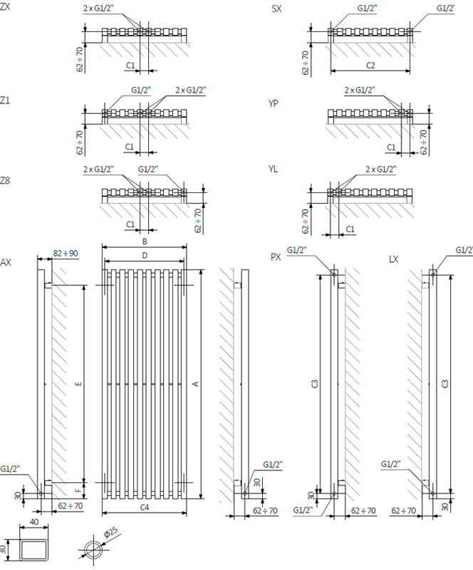 - Конструкція - вертикальні прямокутні трубки 30*40 мм приєднані до круглих колекторів діаметром 25 мм.