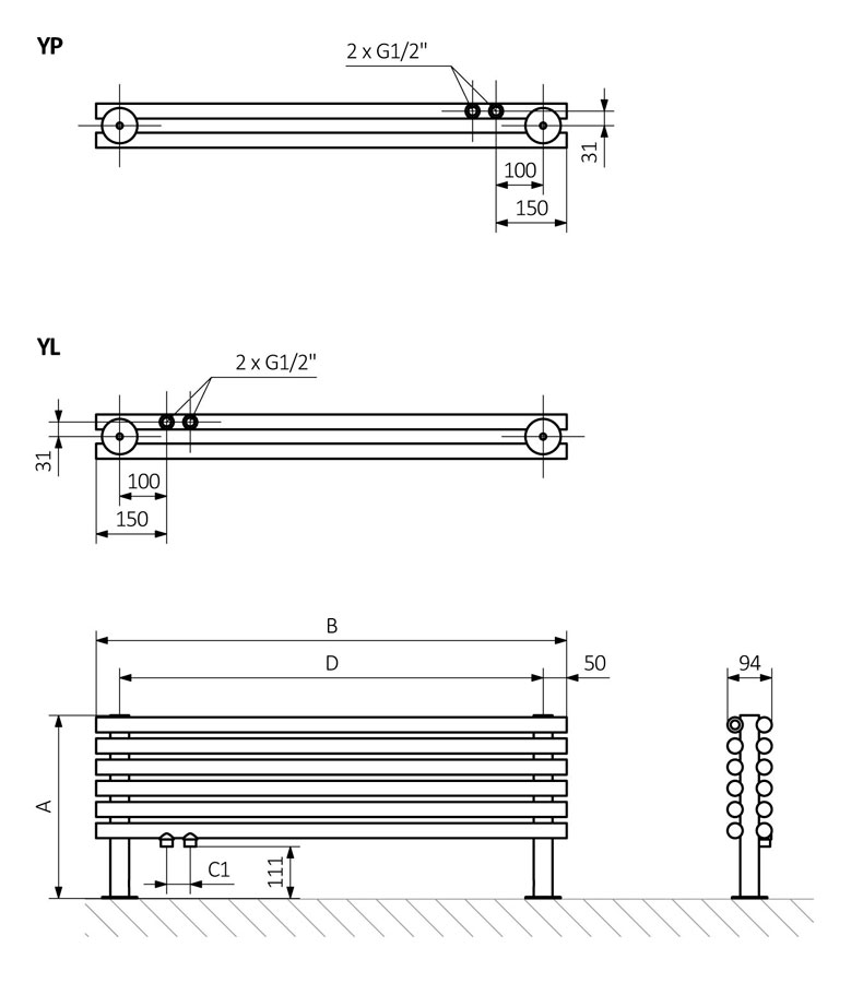 - Конструкція – трубчаста, зібрана з горизонтальних розташованих паралельно круглих профілів. Подвійний ряд обігрівальних труб.