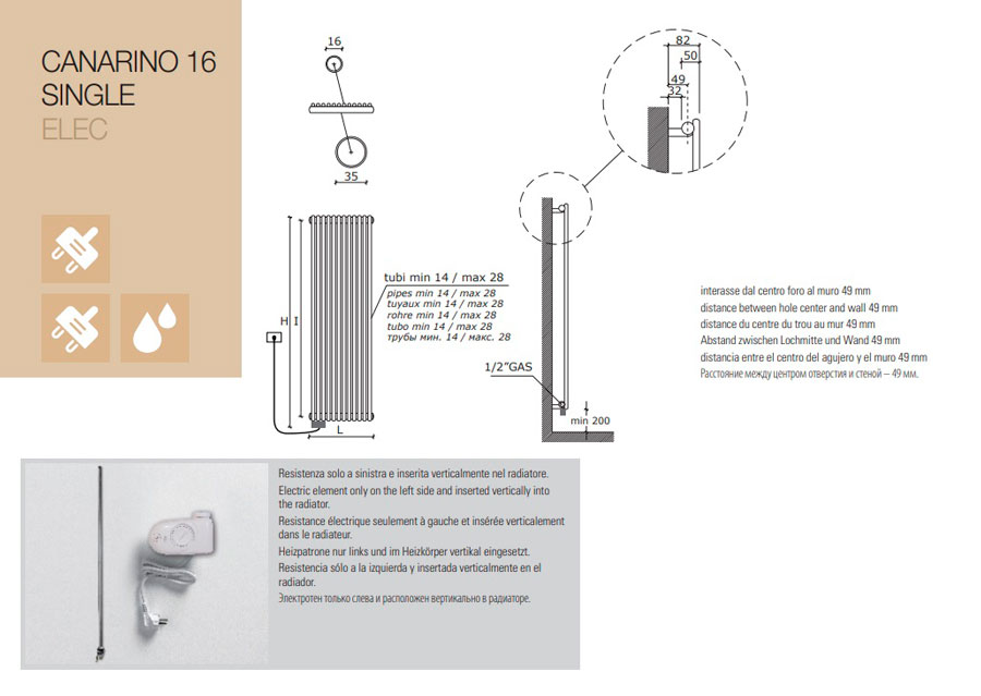 Має елегантний зовнішній вигляд, прилад складається з круглих горизонтальних колекторів та вертикальних круглих трубок діаметром 16 мм. Ціна електричного приладу опалення вказано з урахуванням гліколю (наповнення радіатора) та аналового електротену. Електротен може бути вбудований лише з лівого боку та розташований вертикально. Матеріал - вуглецева сталь.