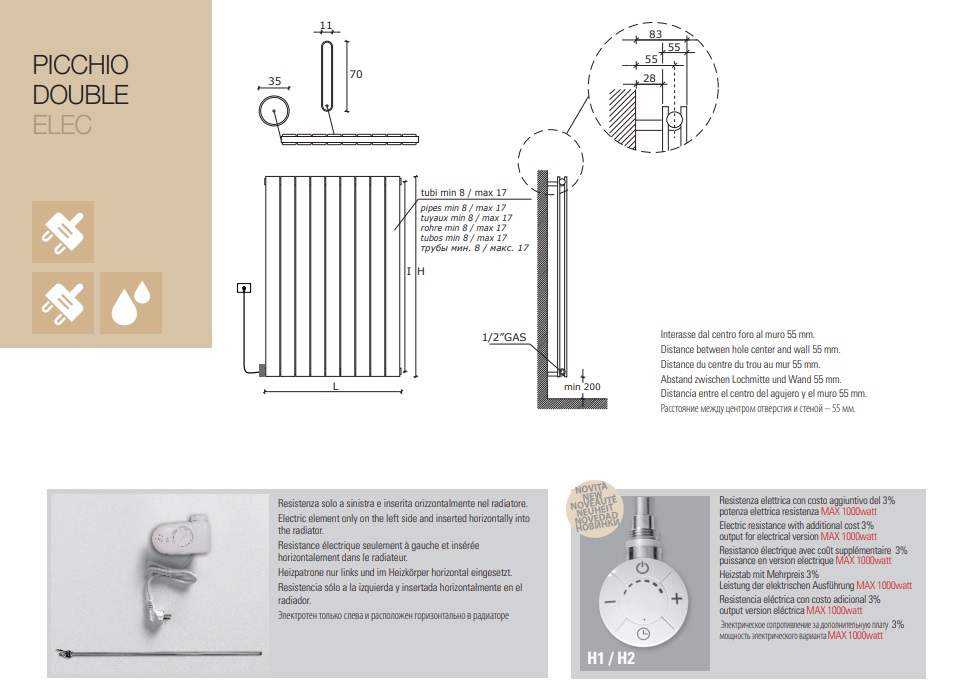 Електричний радіатор Picchio Double від торгової марки Caleido випускається у водяній, комбінованій та електричній версії. На зовнішній вигляд, прилад складається з круглих горизонтальних колекторів та плоских вертикальних трубок 70*11 мм, які розташовані в 2 ряди.