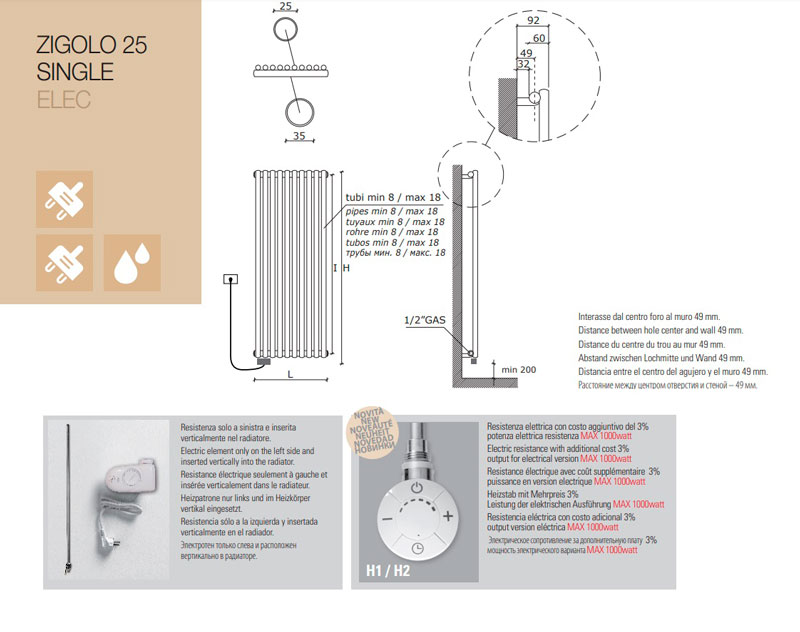 Електричний радіатор Zigolo Single Electric від торгової марки Caleido випускається у водяній, комбінованій та електричній версії.Має елегантний зовнішній вигляд, прилад складається з круглих горизонтальних колекторів діаметром 35 мм та вертикальних круглих трубок діаметром 25 мм. Ціна електричного приладу опалення вказана з урахуванням гліколю (наповнення радіатора) та аналового електротену. Електротен може бути вбудований лише з лівого боку та розташований вертикально. Матеріал – вуглецева сталь.