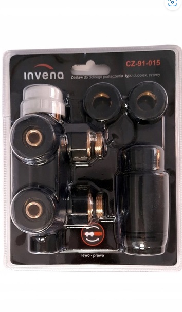 Invena CZ-91-015 Duo-Plex - набір для приєднання радіатора знизу, з виведенням штуцерів на відстані 50 мм, у чорному кольорі. Пропонований комплект, в першу чергу, призначений для підключення дизайнерських радіаторів, які не мають вентильної вставки для термоголовки. У Invena Duo-Plex бінокль оснащений термовставкою, що дозволяє регулювати температуру в приміщенні, навіть у радіаторах без вбудованого термостатичного елемента.