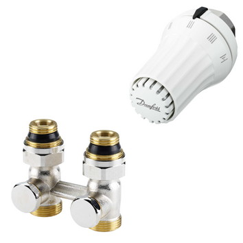 Комплект Danfoss V призначений для обв'язування радіаторів із нижнім підключенням. Бінокль має 50 мм відстань між виводами труб. Термоголовка, залежно від моделі, може встановлюватися на вентильні вставки, вбудовані в радіаторі, з різьбовим з'єднанням М30х1,5 або Click (Danfoss).