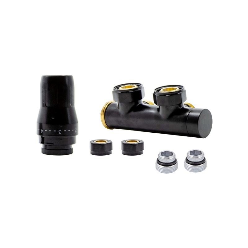 Комплект Heat Base Duo-Plex Black - набір для підключення вертикальних радіаторів від польського виробника радіаторної арматури. Особливістю комплектів Duo-Plex є наявність термостатичної вставки прямо на крані, це дає можливість регулювати температуру в приміщенні, навіть у приладів опалення без вентильної вставки.