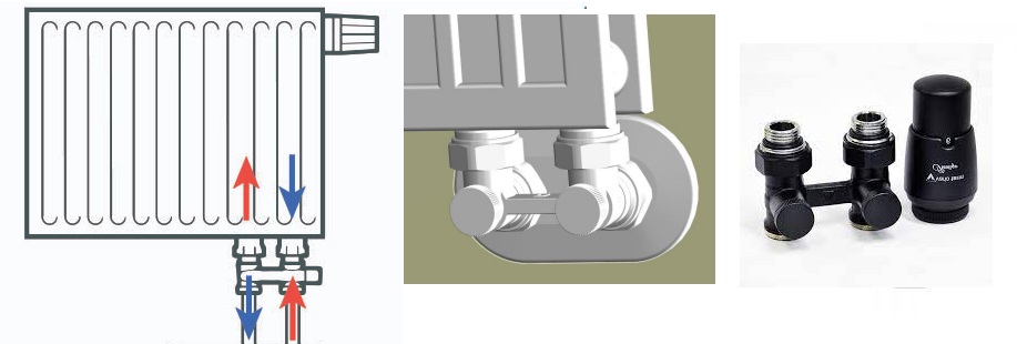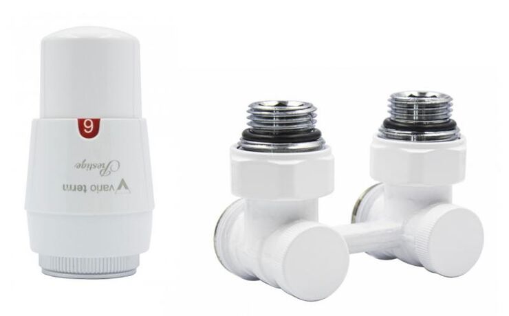 Кутовий комплект для нижнього підключення радіатора Vario Term Typ V White. Даний комплект встановлюється в системах центрального опалення та дозволяє індивідуальне відключення радіатора для заміни або обслуговування без впливу на інші опалювальні прилади в системі. В основному застосовуються для сталевих радіаторів з нижнім підключенням, де відстань між патрубками (між віссю) становить 50 мм.