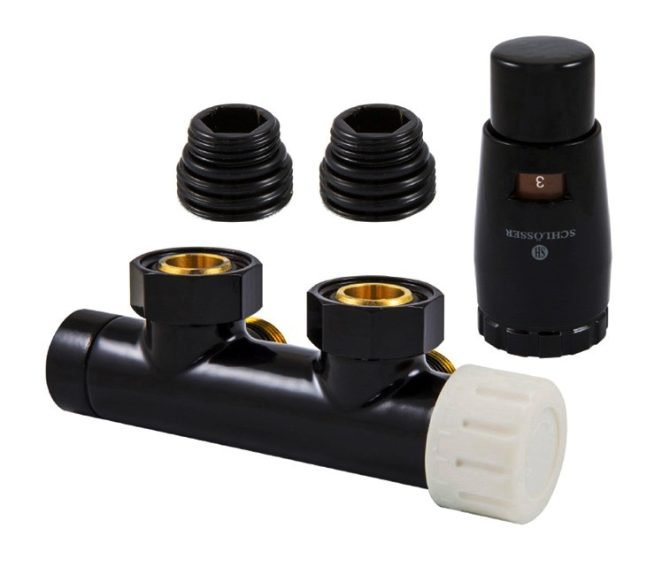 Комплект T Duo-Plex Black - термостатичний набір для нижнього підключення радіаторів від польського виробника якісної дизайнерської арматури ТМ Schlosser. Дуже затребуваний для вертикальних радіаторів без вентильної вставки з нижнім виведенням труб з міжосьовою відстанню 50 мм. Бінокль має термовставку, на яку монтується термоголовка, що дозволяє регулювати температури в приміщенні та заощаджувати на опалення.