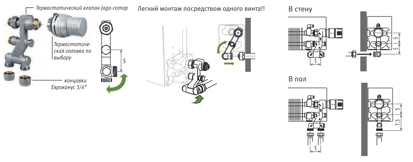 Цей комплект включає клапан Jaga Comap з євроконусом 3/4" і термоголовкою на вибір.