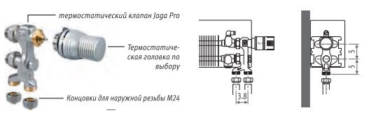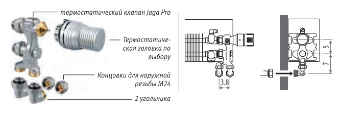 Цей комплект включає клапан Jaga Pro, косинці, кінцівки для зовнішньої труби М24 і термоголовкою на вибір.