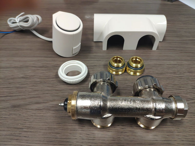 Представлений комплект складається з нижнього вузла підключення з термовставкою, сервоприводом та декоративною накладкою. Можуть бути у прямому та кутовому виконання. Колір – чорний.