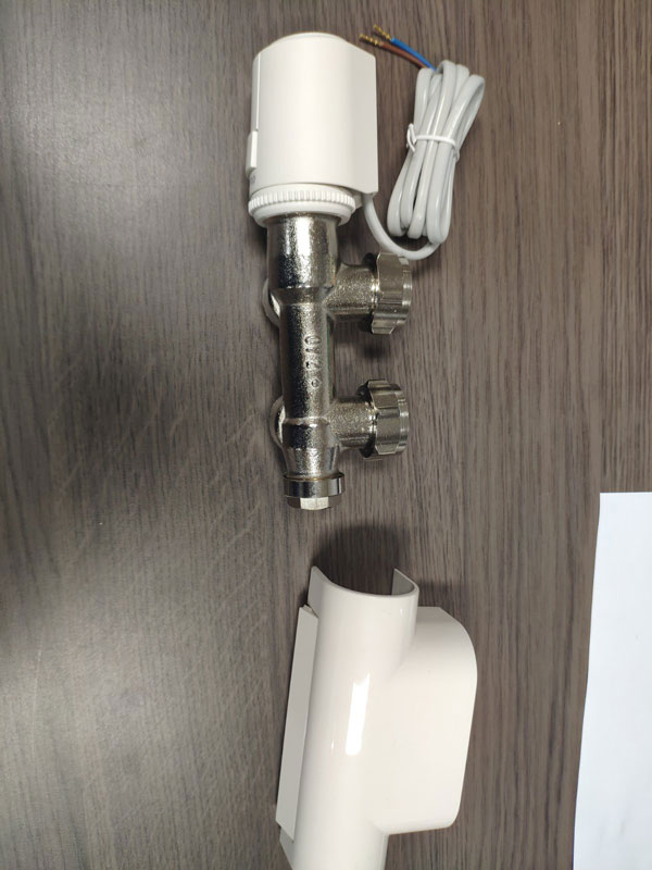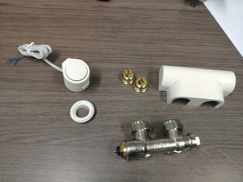 Представлений комплект складається з нижнього вузла підключення з термовставкою, сервоприводом та декоративною накладкою. Можуть бути у прямому та кутовому виконання. Колір – білий.