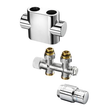 Multiblock T/Uni SH Chrome - приєднувальний комплект для радіаторів і рушникосушок з нижнім підключенням (міжвісь 50 мм) від провідного німецького виробника Oventrop. Дані комплекти називають мультиблоками, дуоплексами, їх особливістю є вузол нижнього підключення з термостатичною вставкою, на яку монтується термоголовка. Це дозволяє регулювати подачу теплоносія у радіаторах без вентильної вставки.