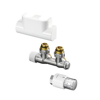 Oventrop Multiblock T/Uni SH White - приєднувальний комплект для радіаторів і рушникосушок з нижнім підключенням (міжвісь 50 мм) від провідного німецького виробника Oventrop. Дані комплекти називають мультиблоками, дуоплексами, їх особливістю є вузол нижнього підключення з термостатичною вставкою, на яку монтується термоголовка. Це дозволяє регулювати подачу теплоносія у радіаторах без вентильної вставки.