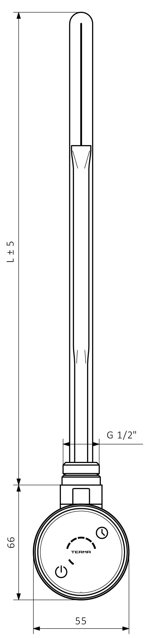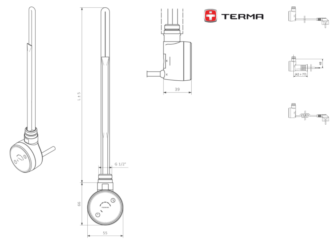 Тен Terma Dry - регулятор з нагрівальним елементом для електричних і комбінованих рушникосушителів. Дана модель має постійну температуру нагрівання - 48°C. Є можливість зміни температур у діапазоні від 43 до 60 градусів.