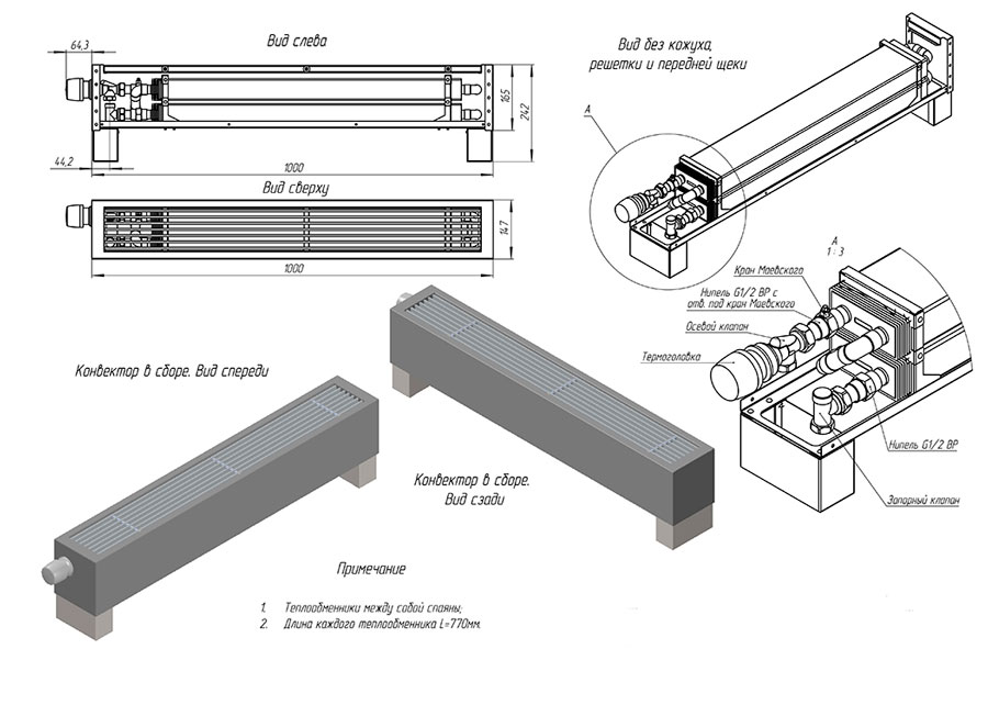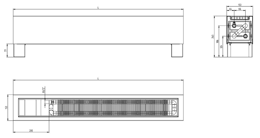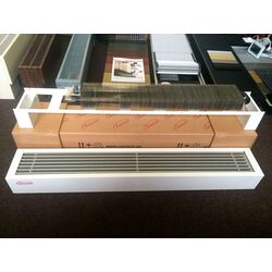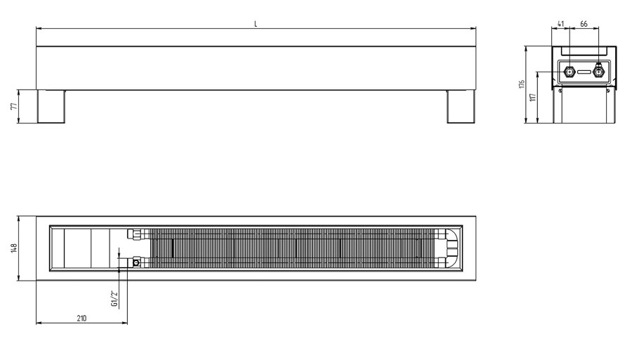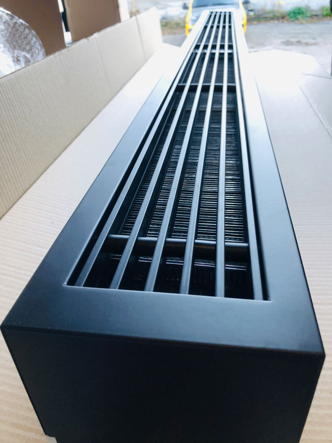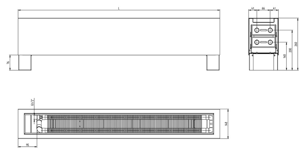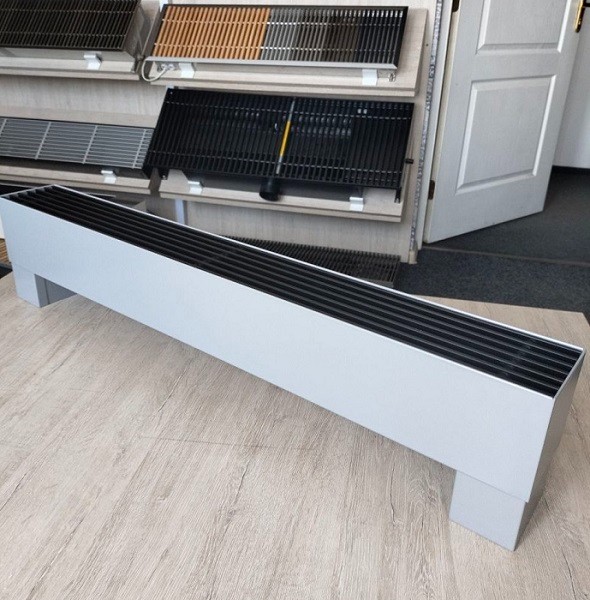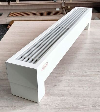 Достатньо потужний, але вузький підлоговий конвектор, досягає своїх показників за рахунок 2-х теплообмінників розташованих вертикально. Висота - 246 мм з урахуванням ніжки 76 мм та ширина приладу дорівнює 148 мм.