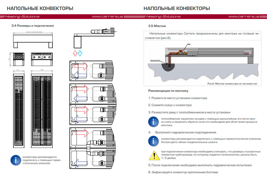 Для монтажу конвектора необхідно розмітити місце установки - зняти кожух з конвектора - розмістити раму з теплообмінником і виконати гідравлічне підключення (для встановлення рекомендується використовувати термостатичні клапани та гнучкі шланги розміром 1/2") - зафіксувати конвектор фіксуючими болтами - установити. Після підключення потрібно зробити гідравлічне випробування.