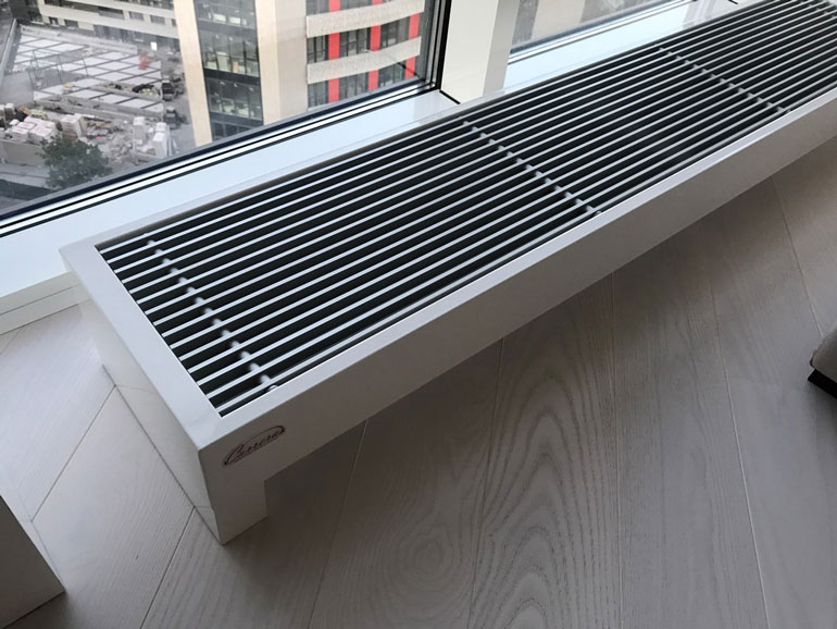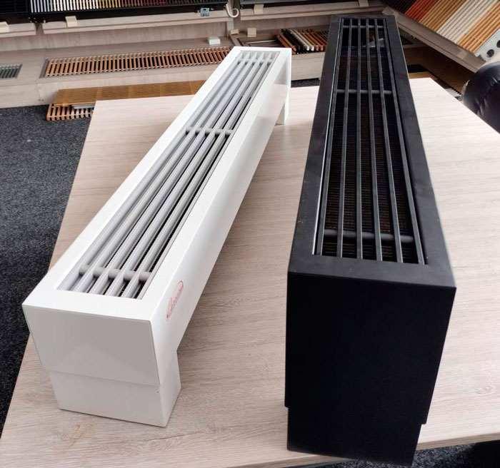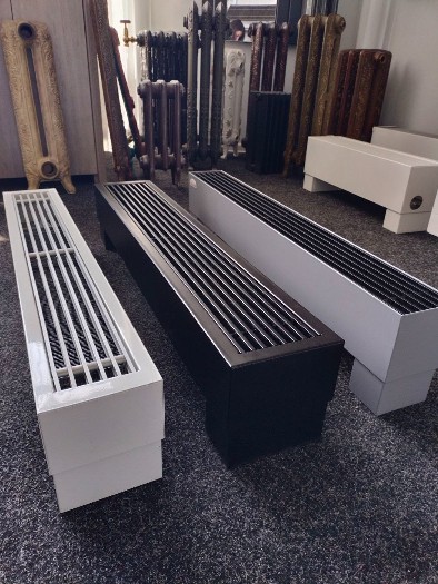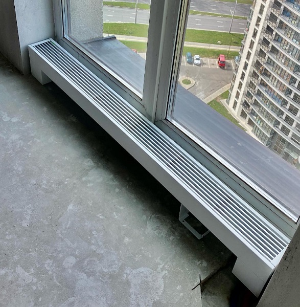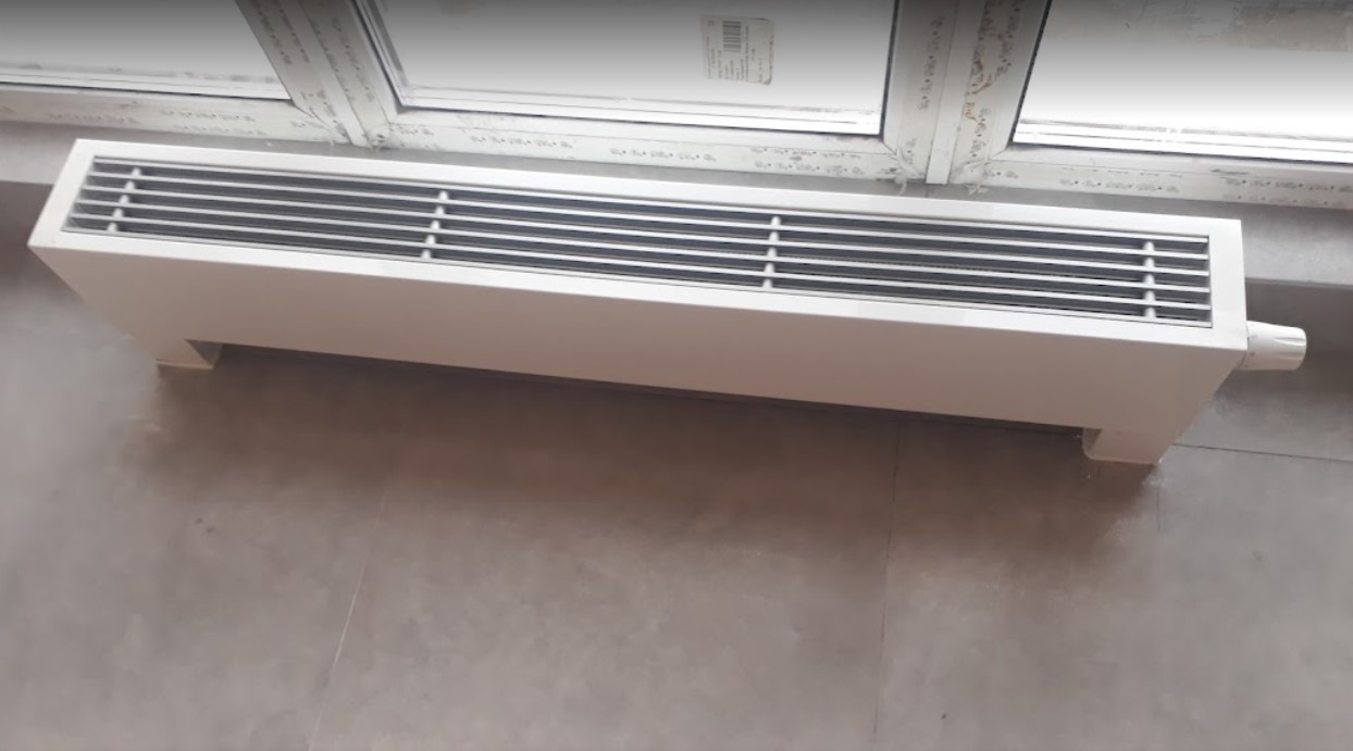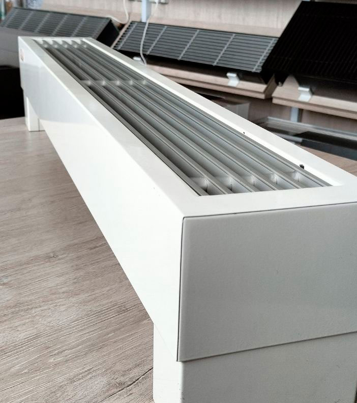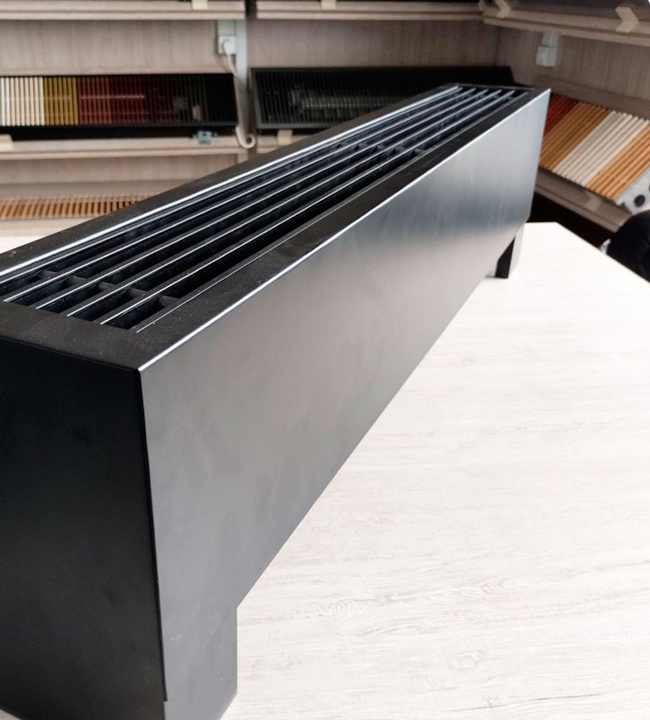 Розташований на підлозі біля вітражного вікна, конвектор за рахунок природної конвекції здатний гарантовано створювати спрямований потік теплого повітря. За мінімальних витрат на енергоносій можна зробити в приміщенні різного використання максимально комфортабельний мікроклімат. Якщо потрібно обігрівати кімнату з панорамним склінням значних розмірів, можна встановити кілька штук таких нагрівальних приладів, з'єднавши їх схемою паралельного підключення теплоносія.
