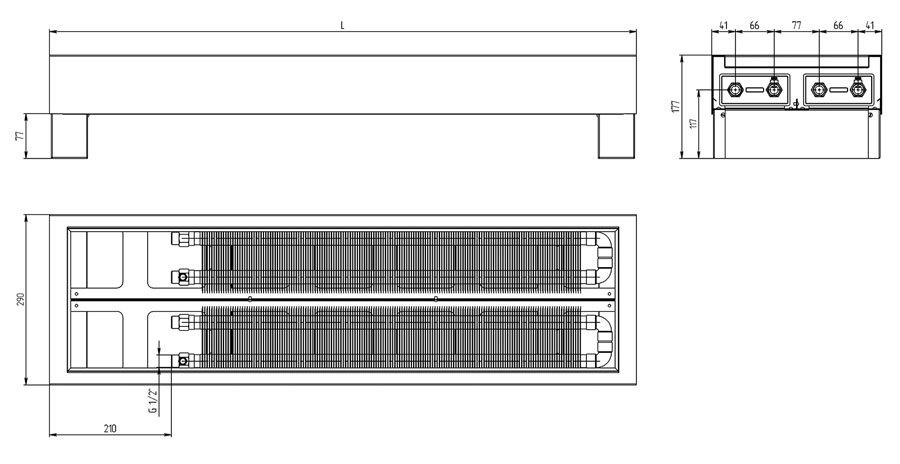 Низький опалювальний прилад із двома теплообмінниками. Висота конвектора лише 176 мм, при ширині 290 мм.