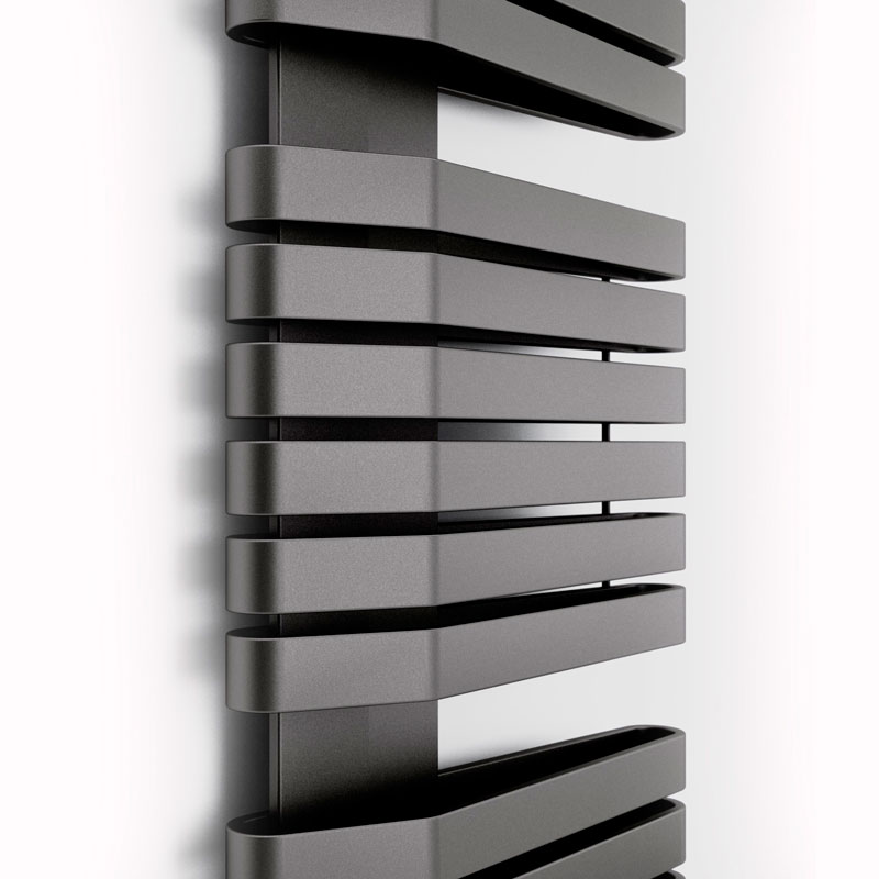 Terma Iron S Electric - очень необычный, слегка брутальный электрический полотенцесушитель от польского производителя отопительной техники. Данная модель состоит из двух независимых элементов: внутренний обогреватель и оребрение вокруг него. Плоские ребра, размером 10х50 мм, огибают ассиметрично расположенный коллектор, что смягчает общее восприятие сушителя. Внутренний коллектор, на выбор покупателя, может быть расположен слева или справа.