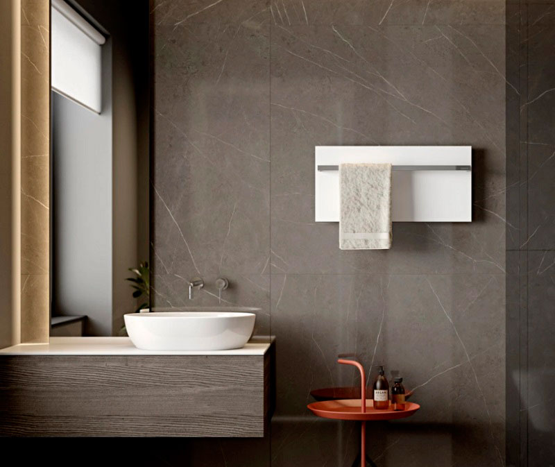 Представлена модель виготовлена з міцного гартованого скла (передня частина) та металевого корпусу (задня частина). Нагрівальний елемент розміщений посередині та немає доступу до повітря й вологи. Рейлінг має прямокутну форму і зроблений з нержавіючої сталі.