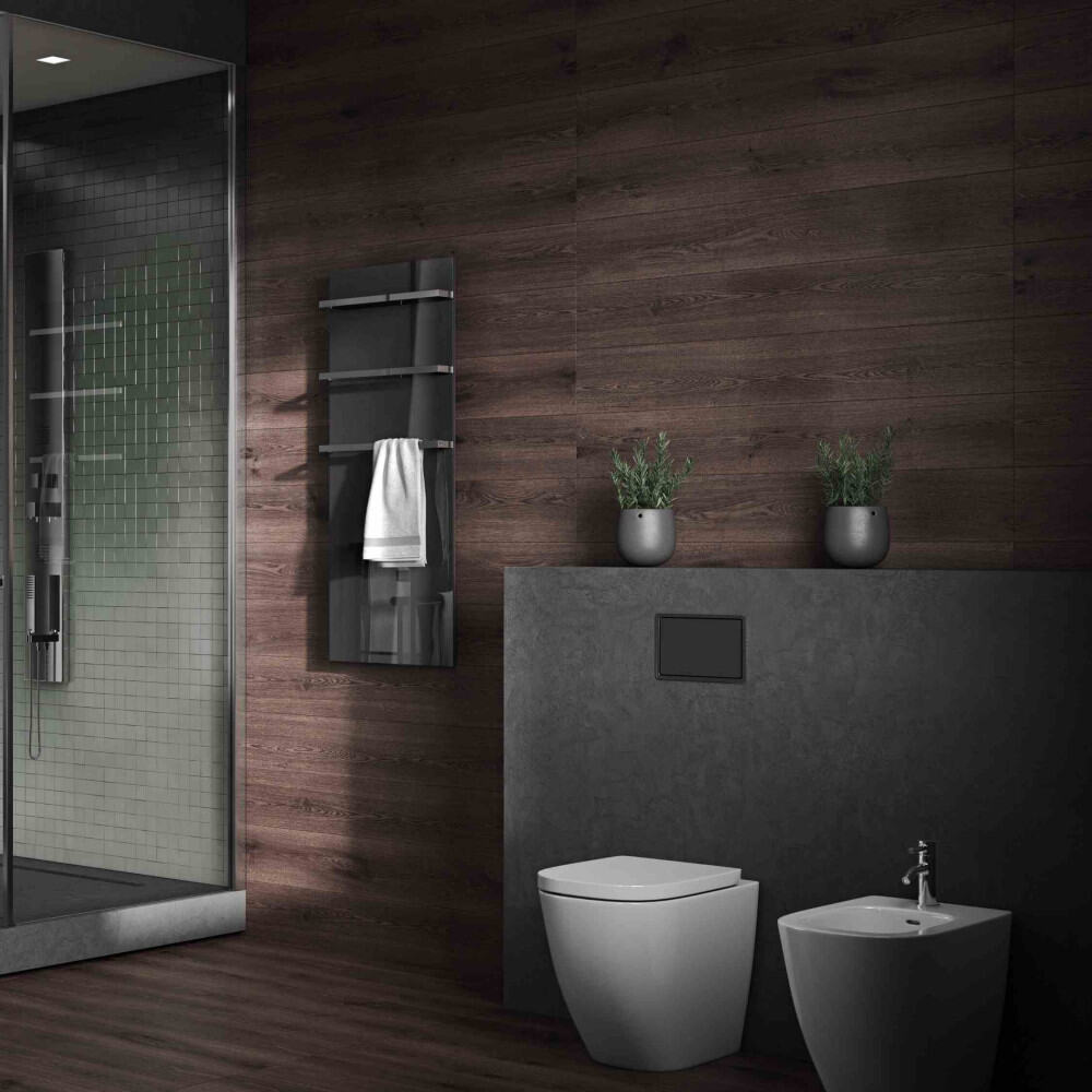 Представлена модель виготовлена з міцного гартованого скла (передня частина) та металевого корпусу (задня частина). Нагрівальний елемент розміщений посередині та немає доступу до повітря й вологи. Три рейлінги мають прямокутну форму і зроблені з нержавіючої сталі. Колір - чорний.