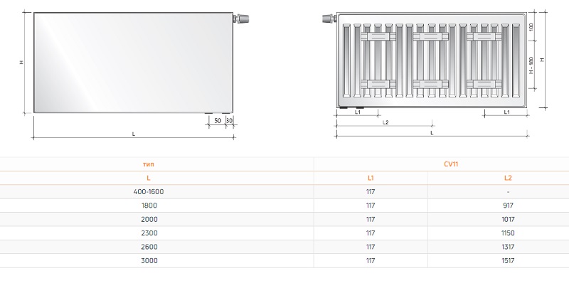Нижнє (50 мм) - подача завжди розташована за 80 мм від бокової стінки, зворотка за 30 мм. Радіато підключається за допомогою стандартного вузла нижнього підключення (бінокля).