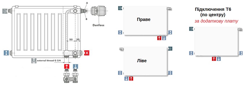 Такий вид під'єднання представляє собою 4 незаглушених отвори по бокам радіатора, 2 з яких використовуються для підключення до труб опалення за допомогою кранів, інші 2 глушаться краном маєвського та заглушкою або зливною пробкою. Розмір отворів - 1/2".