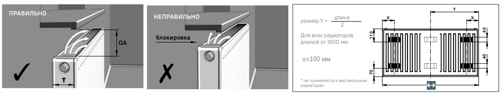 У багатьох покупців виникає питання по розміщенню радіатора під підвіконням, а саме розмір відступів від підлоги та підвіконня. Для 100% використання теплової потужності батареї потрібно дотримуватись повної циркуляції повітря, для цього мають бути зазори під та над радіатором.