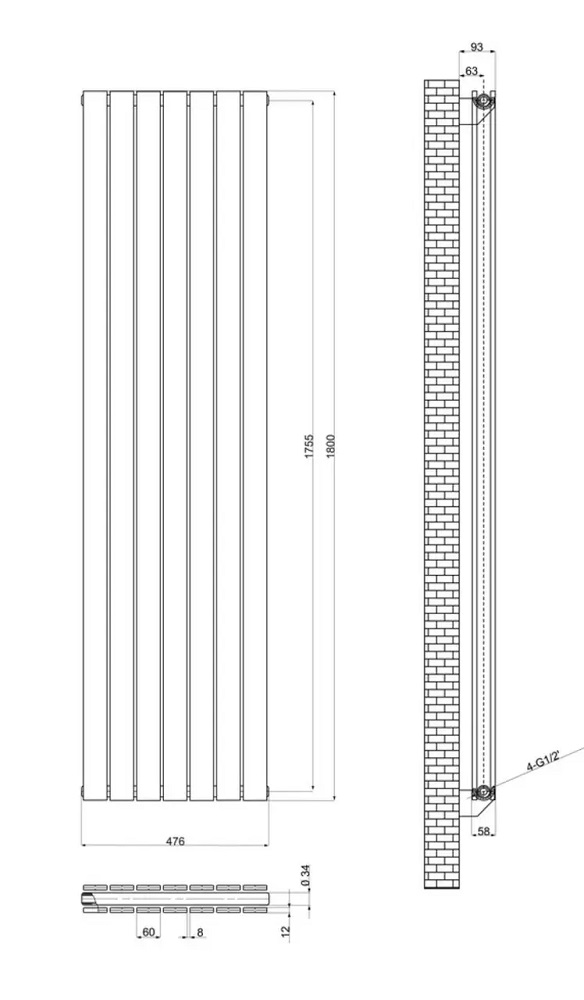 | Висота, мм | Ширина, мм | К-ть секцій | Глибина, мм | Тепловіддача, Вт (при 65С) | Площа обігріву, м2 | Міжвісь, мм |