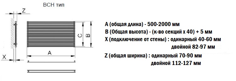 Розміри радіатора Betatherm Ellipse Double горизонтальний