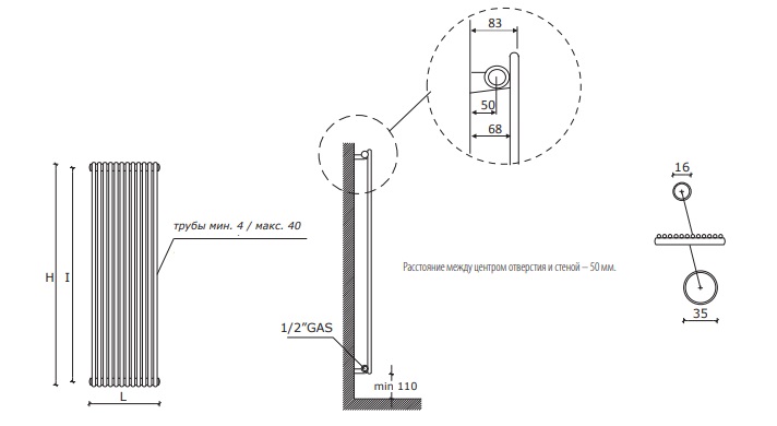 Підключення італійських дизайнерських радіаторів Калейдо за замовчуванням йде бічне, з'єднання з трубами зверху і знизу (міжосьова відстань H - 50 мм). Для вертикальних батарей більшою популярністю користується нижнє підключення (за додаткову плату), його можна зробити центральним для приладів із парною кількістю секцій та лівим/правим для непарної кількості секцій. Рекомендується встановлення з відступом від 110 мм від підлоги.