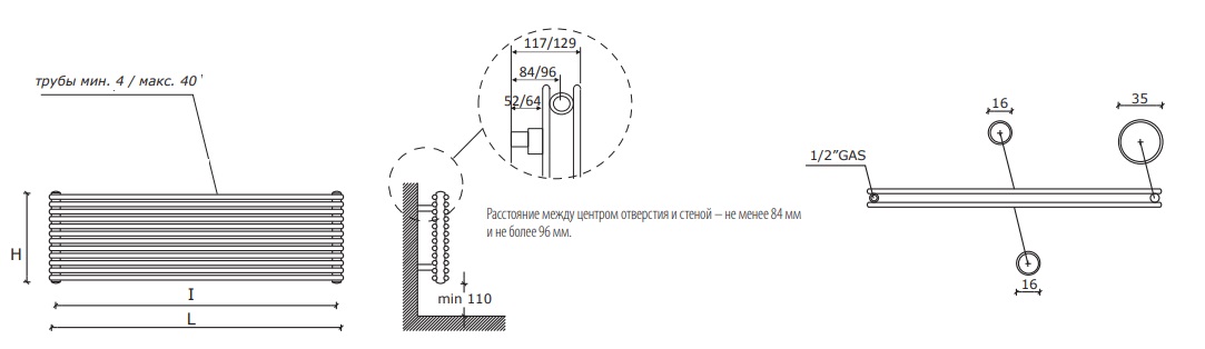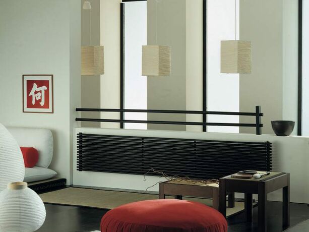 У горизонтальних радіаторах Калейдо за замовчуванням йде нижнє різнобічне підключення. За додаткову плату за необхідності можна замовити виконання з боковим або нижнім виведенням труб з міжосьовою відстанню 50 мм.
