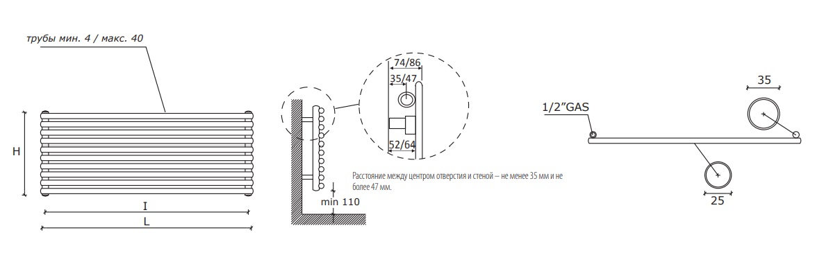 У горизонтальних радіаторах Калейдо за замовчуванням йде нижнє різнобічне підключення. За додаткову плату за необхідності можна замовити виконання з боковим або нижнім виведенням труб з міжосьовою відстанню 50 мм.