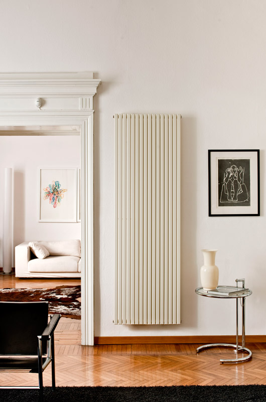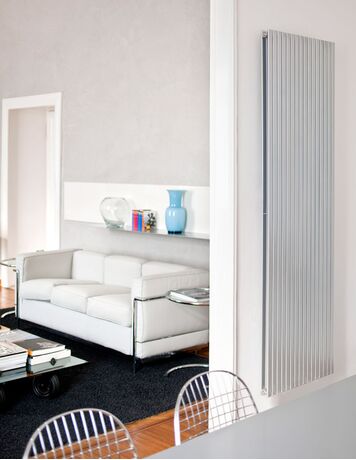 Caleido Regolo Double - дизайнерський радіатор опалення, виконаний у вигляді двох рядів плоских вертикальних труб, приварених до горизонтального колектора. Ширина трубки - 35 мм, діаметр колектора - 35 мм. Простий та лаконічний зовнішній вигляд запропонованої моделі впишеться в будь-який інтер'єр.