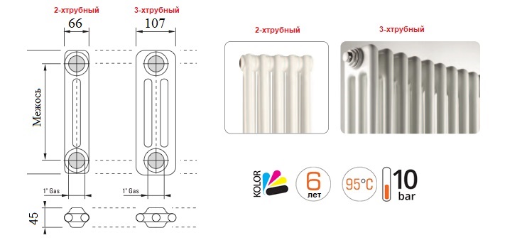 - 2-х трубні (66 мм), відстань від стіни до центру колектора - 96-106 мм