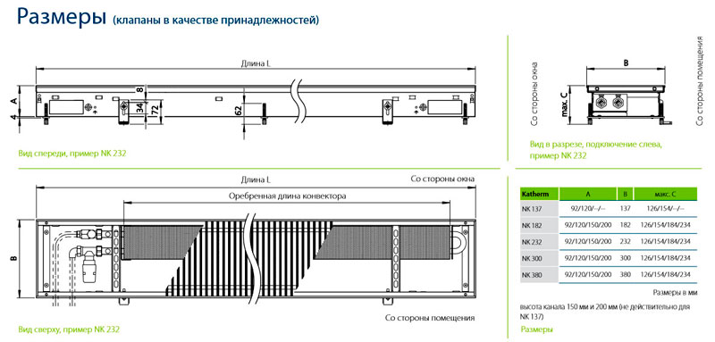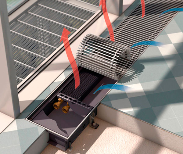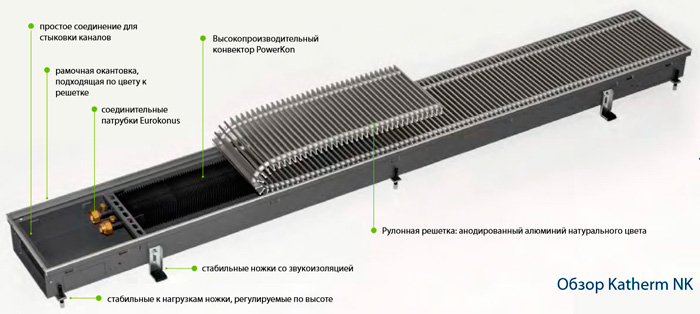 Внутрішньопідлогові конвектори Katherm NK бренду KAMPMANN (Німеччина) ефективно забезпечують ізоляцію приміщення від холодного повітря за рахунок природної конвекції. Прилади надходять споживачеві готовими до монтажу, призначені для встановлення перед великими вікнами, що досягають підлоги. Потрібні для монтажу в житлових будинках та офісах, торгових та виставкових центрах.