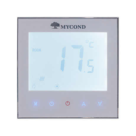 Сучасний термостат Mycond Touch Black призначений для управління роботою електричних конвекторів і теплої підлоги. Терморегулятор випускається у двох кольорах: чорний та білий, має сенсорний екран. Великі цифри і зрозумілість символів допомагає легко налаштувати потрібний вам режим. Призначений для настінного монтажу.